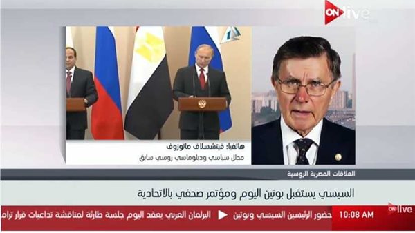 قال فيتشسلاف ماتوزوف، المحلل السياسي الروسي والدبلوماسي السابق: إن زيارة الرئيس الروسي فلاديمير بوتين إلى مصر، ليست الزيارة الأولى من نوعها، موضحًا أن العلاقات بين مصر وروسيا أصبحت قوية وتقليدية.