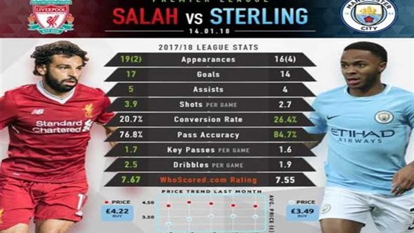وقبل مواجهة ليفربول ومانشستر سيتي في السادسة مساء اليوم، ومنافسة اللاعبين الأبرز من الناحية التهديفية للفريقين، يتضح تفوق "صلاح" على "ستيرلينج" في تسجيل الأهداف حيث سجل المصري 17 هدفًا مقابل 14 للإنجليزي.