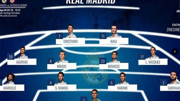 وأعلن الفرنسي، زين الدين زيدان، المدير الفني لفريق ريـال مدريد عن تشكيل فريقه، الذي ضم كل من: كيلور نافاس في حراسة المرمى، سيرجيو راموس، رافائيل فاران، مارسيلو، داني كارفخال، فاسكيز، كاسيميرو، كوفاسيتش، أسينسيو، جاريث بيل، كريستيانو رونالدو.