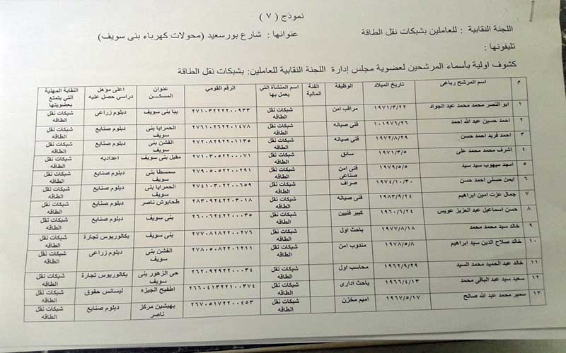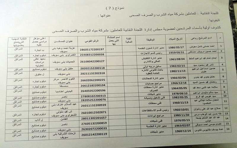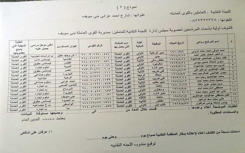 كانت لجنة تلقى طلبات الترشيح لانتخابات اللجان النقابية ببني سويف أعلنت إغلاق باب الترشيح بإجمالي 281 مرشحًا قدموا أوراقهم لخوض الانتخابات النقابية العمالية بالمحافظة.