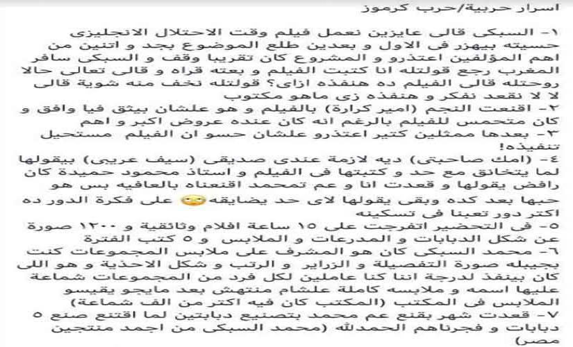 وتابع: سافر السبكي للمغرب وقبل عودته كانت الفكرة قد اختمرت في ذهني، وقمت بكتابة الفيلم بالكامل، وحينما عاد أخبرته بانتهائي من كتابة السيناريو والحوار، وأرسلت له نسخة للاطلاع عليها، وما كاد ينتهي منها حتى هاتفني طالبًا مني الذهاب للقائه، وعند وصولي إليه باغتني بسؤال: "الفيلم ده هاننفذه إزاي؟!، فما كان مني إلا أن أخبرته بإمكانية التعديل على السيناريو ليصبح قابلًا للتنفيذ إذا كانت صعوبته ستحول دون إتمام العمل، ففاجئني انه سينفذ السيناريو كما هو دون ادنى تعديلات؟