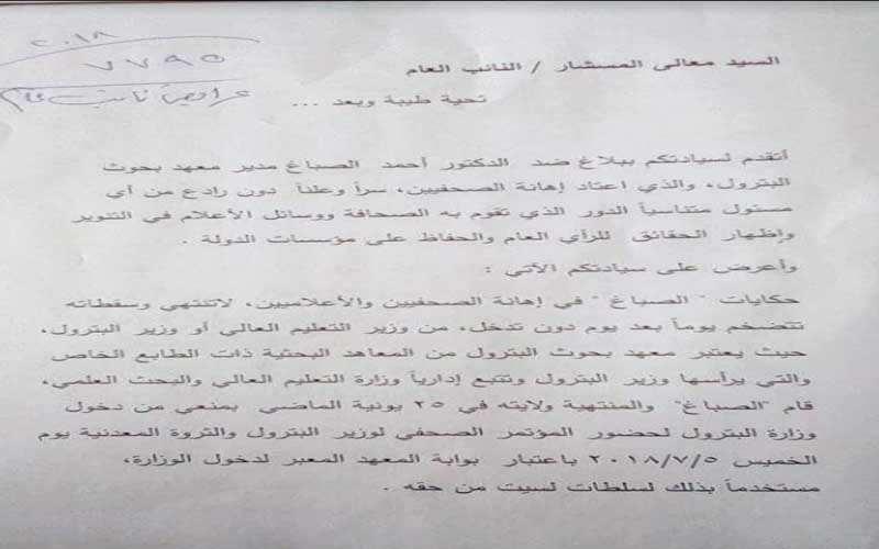أتقدم ببلاغ ضد أحمد الصباغ مدير معهد بحوث البترول، حيث اعتاد علي سبي وقذفي بألفاظ نابية، وتصرفات لا تليق بمسؤول في الدولة.