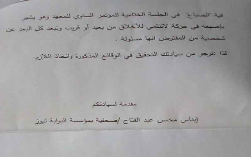 تقدمت الزميلة إيناس محسن عبد الفتاح، الصحفية بمؤسسة "البوابة نيوز"، ببلاغ عاجل للمستشار نبيل صادق، النائب العام، ضد أحمد الصباغ، مدير معهد بحوث البترول، وجاء في نص البلاغ الذى قيد برقم .