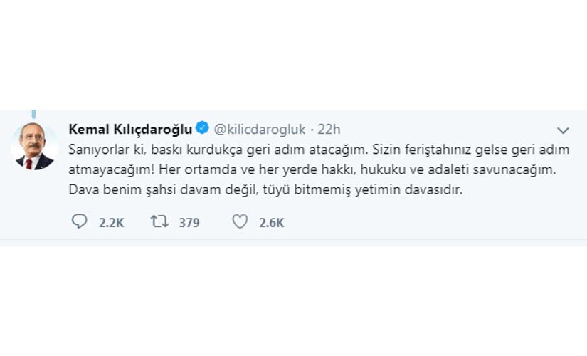 تعقيبًا على فتح تحقيق ضده أمام النيابة العامة بتهمة الإساءة للرئيس التركى رجب طيب أردوغان غرد أكمل جليجدار أوغلو زعيم أكبر حزب معارض في تركيا "الشعب الجمهورى" على موقع التواصل الاجتماعى "توتير" قائلًا: هم يعتقدون بأن ضغوطهم سوف تجعلنى أتراجع. لن أتراجع إذا كنت قادمًا! سأدافع عن الحق والقانون والعدالة في كل بيئة وفي كل مكان.