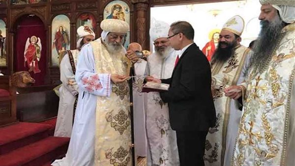قال القس بولس حليم المتحدث باسم الكنيسة القبطية الأرثوذكسية - في تصريح اليوم الأحد - إن عمدة مدينة سانت كرانستون أهدى البابا تواضروس الثاني مفتاح المدينة أثناء حضوره للترحيب بقداسته بكنيسة السيدة العذراء والشهيد مارمينا التي تم تدشينها اليوم.