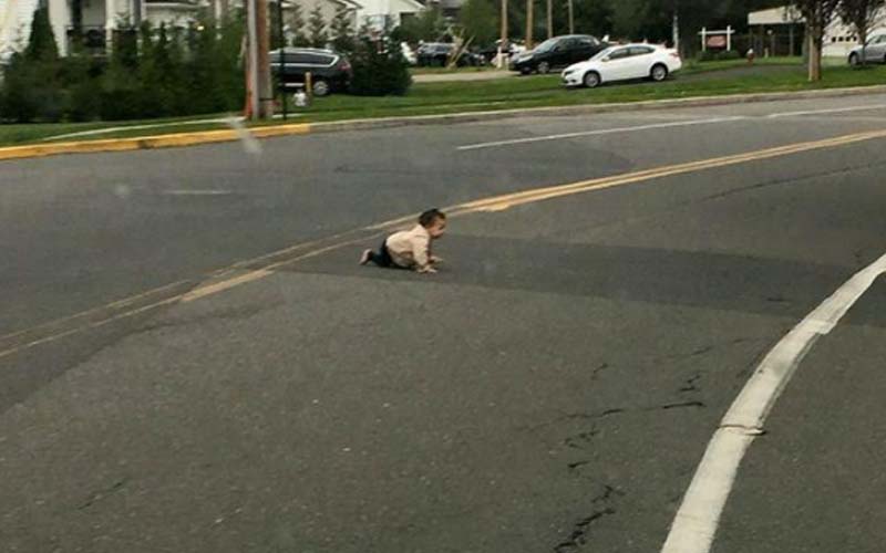 تظهر صورة مروعة طفلًا يبلغ من العمر عشرة أشهر يزحف على طريق سيارات سريع مزدحم في مشهد سيصيب الولدان شيبا.
