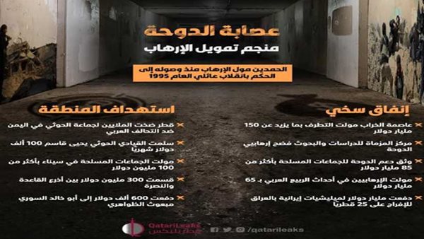 وكانت "قطريليكس" نشرت على صفحتها الرسمية بموقع التواصل الاجتماعي "تويتر " منذ قليل عن دعم نظام الحمدين لمختلف التنظيمات الإرهابية بأكثر من 150 مليار دولار حيث مول تنظيم الحمدين الجماعات المسلحة بسيناء بـ100 مليون دولار والإرهابيين في أحداث الربيع العربي بمبلغ 65 مليار دولار، ودفعت مليار دولار لميلشيات إيران بالعراق للإفراج عن 25 قطرياً.