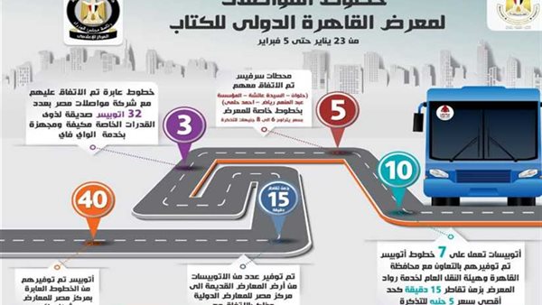 نشر المركز الإعلامي لمجلس الوزراء إنفوجراف خطوط مواصلات للوصول إلى معرض الكتاب الدولي، الذي فتح أبوابه للجمهور من اليوم وحتى ٥ من الشهر المقبل وتوفير ٣٢ أتوبيسا صديقا للبيئة، مكيفا ومجهزا بخدمة الواي فاي، وكذلك محطات سرفيس، تم الاتفاق عليها منها حلوان والسيدة عائشة والمؤسسة وعبدالمنعم رياض وأحمد حلمي.