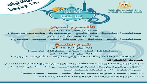 جدير بالذكر أن من أهم شروط الاشتراك ألا يكون تم المشاركة للرحلات خلال العامين الماضيين (2017-2018)، وأن يتم الالتزام بأن يكون تاريخ ميلاد المشارك في الفترة البينية من (1/2/2000 وحتى 1/3/2006)، ورسوم الاشتراك 250 جنيهًا والمشاركة بأولوية الحجز، بالإضافة أن يكون الطليع المشارك لا يعانى من الامراض المزمنة (القلب – السكر – الصرع)، ويتم التسجيل بمعرفة مديريات الشباب والرياضة المشاركة بالمحافظات.