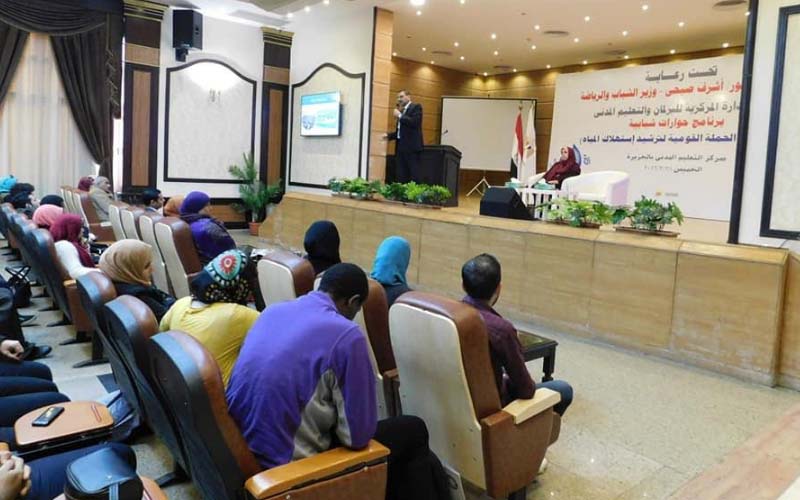 تنفذ وزارة الشباب والرياضة، الإدارة المركزية للبرلمان والتعليم المدني اليوم، بمركز التعليم المدني بالجزيرة بالتعاون مع وزارة الموارد المائية والري برنامجا حواريا مع الشباب، تحت شعار "الحملة القومية لترشيد استهلاك المياه"، يأتي ذلك ضمن سلسلة الحوارات الشبابية التي تنفذها الوزارة لتوعية الشباب بالقضايا المجتمعية والقومية المختلفة.