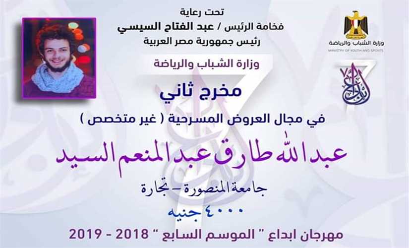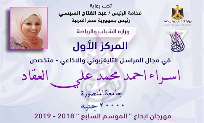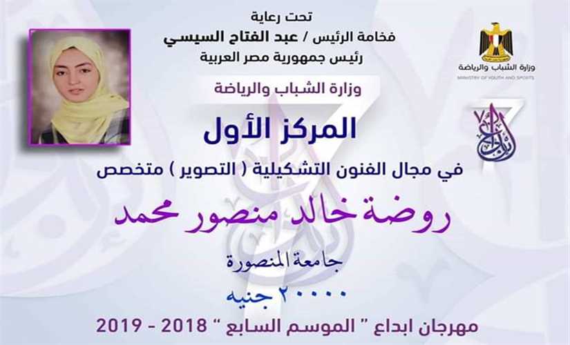 وحصل على المركز الأول كلًا من روضة خالد منصور من كلية الفنون الجميلة في مجال التصوير الزيتي متخصص، ومنه الله محمد أحمد في مجال الجرافيك الطباعة الفنية غير متخصص، وإسراء أحمد العقاد من تمهيدي ماجستير كلية الآداب في مجال المراسل التلفزيوني متخصص، ومحمد حافظ حبيب من كلية الزراعة في مجال المراسل التلفزيوني غير متخصص، وهالة السلاب من كلية الصيدلة في مجال العرض المسرحي غير متخصص.