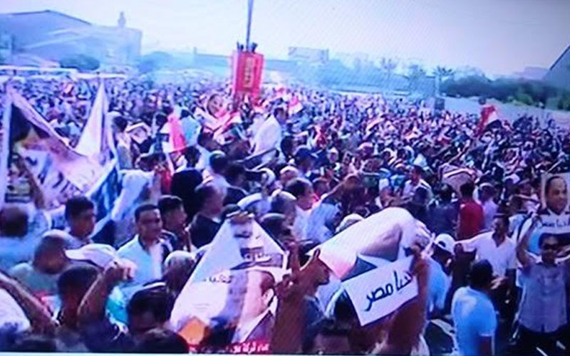 توافد ملايين المصريين إلى المنصة في مدينة نصر تأييداً ومبايعة للرئيس عبدالفتاح السيسي والدولة المصرية في مواجهة دعوات الجماعة الإرهابية ومن يدور في فلكها لتخريب مصر ونشر الفوضى تنفيذاً لأجندات مغرضة.