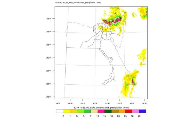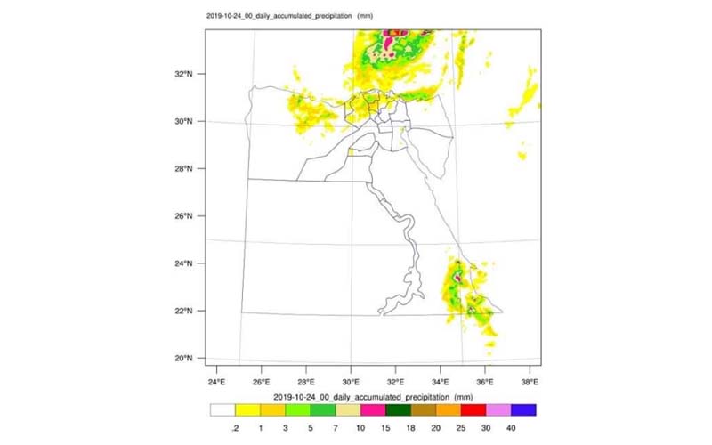 أظهرت نتائج نماذج التنبؤ بالإمطار بمركز التنبؤ بقطاع التخطيط وخرائط الامطار على جمهورية مصر العربية بهيئة الارصاد الجوية التابعة لوزارة الطيران المدنى وذلك خلال الفترة من غدا ٢٣ أكتوبر وحتى الجمعة ٢٥ أكتوبر ٢٠١٩ أهم التوقعات لحالة الطقس خلال تلك الفترة .