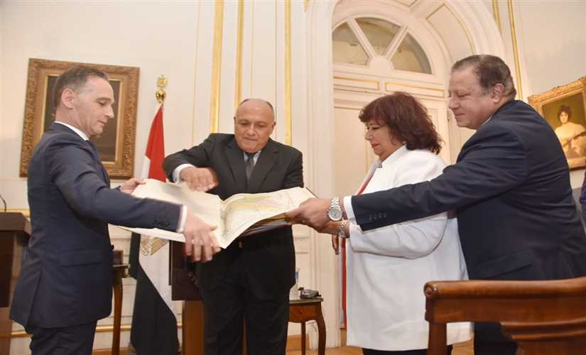 تسلمت الدكتورة إيناس عبدالدايم وزيرة الثقافة، من سامح شكري وزير الخارجية ونظيره الالماني هايكوماس، أطلس سديد الأثري، في مؤتمر صحفي عقد بمقر وزارة الخارجية بحضور الدكتور هشام عزمي رئيس دار الكتب والوثائق القومية.