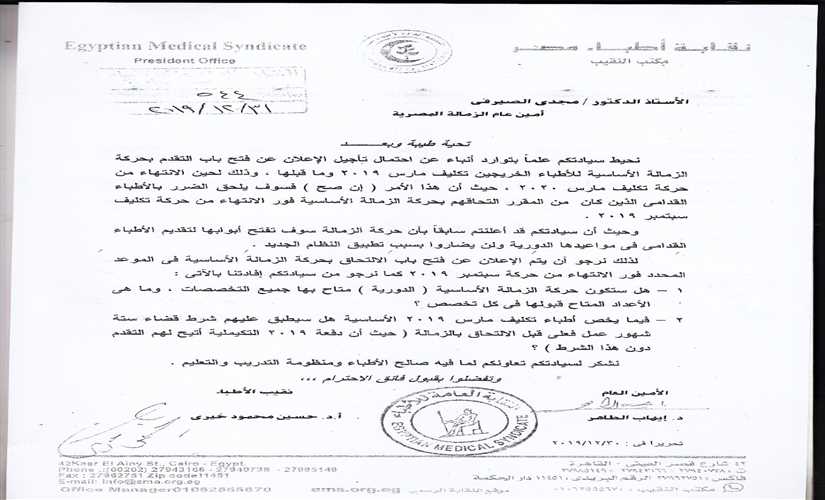 نصت الخطابات على "نحيطكم علما بتوارد أنباء عن احتمالية تأجيل الإعلان عن فتح باب التقدم بحركة الزمالة الأساسية للأطباء الخريجين تكليف مارس 2019 وما قبلها ، وذلك لحين الانتهاء من حركة تكليف 2020، حيث أن الأمر (إن صح) فسوف يلحق الضرر بالأطباء القدامي، الذين كان من المقرر التحاقهم بحركة الزمالة الأساسية فور الانتهاء من حركة تكليف سبتمبر 2019.