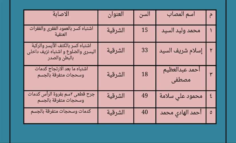 تبين من خلال الكشف المبدئي للمصابين ما بين الإصابة باشتباه في كسور بالعمود الفقري والفقرات العنقية، كسور بالاكتاف، أشباه في نزيف وارتجاج أيضا وجروح قطعية وكدمات وسحجات في أنحاء متفرقة من الجسم، وحصلت "بوابة روزاليوسف" على البيان التالي بأسماء مصابي السيارة:
