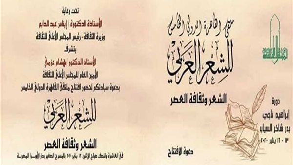 ينظم المجلس الأعلى للثقافة بأمانة الدكتور هشام عزمي، ملتقى القاهرة الدولي الخامس للشعر العربي في الفترة من 13 إلى 16 يناير الحالي، بمشاركة أكثر من 100 شاعر وناقد من 15 دولة، وتحت رعاية الدكتورة إيناس عبد الدايم، وزيرة الثقافة.
