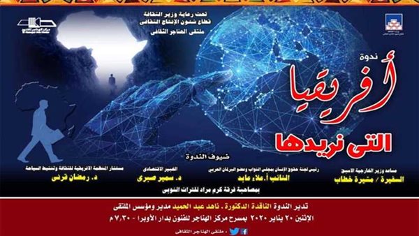 يقيم قطاع شؤون الإنتاج الثقافي، برئاسة المخرج خالد جلال، لقائه الشهري لملتقى الهناجر الثقافي، تحت عنوان "إفريقيا التي نريدها"، من خلال الإدارة العامة للنشاط الثقافي والفني بالقطاع، وذلك في السابعة والنصف من مساء يوم الاثنين ٢٠ يناير الجاري، بمركز الهناجر للفنون، تحت إشراف الفنان محمد دسوقي مدير المركز.