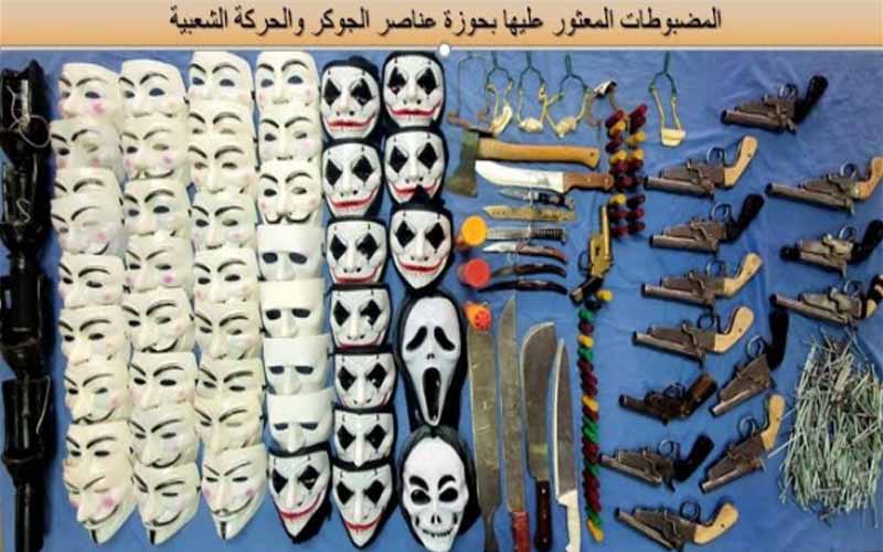 كما أسفرت جهود المتابعة عن تحديد المجموعات الإلكترونية التي تضطلع بعمليات الاستقطاب والإعداد للقيام بأعمال الشغب وتخريب منشآت الدولة، حيث أمكن ضبط عدد من العناصر القائمة عليها وعُثر بحوزتهم على (14 فرد خرطوش وكمية من طلقات الخرطوش– ماسكات الجوكر– أقنعة بدائية واقية من الغاز– أسلحة بيضاء ونبال لقذف الحجارة– كميات من العوائق المسمارية لإلقائها على الأرض لتعطيل السيارات).