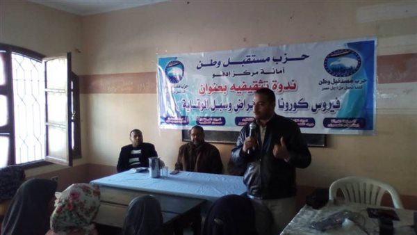 نظم حزب مستقبل وطن، برئاسة المهندس أشرف رشاد الشريف، في محافظة أسوان، ندوة تثقيفية عن فيروس كورونا والأخطار وطرق الوقاية، في مركز أدفو، تحت رعاية النائب حسن سيد خليل، أمين الحزب بالمحافظة.