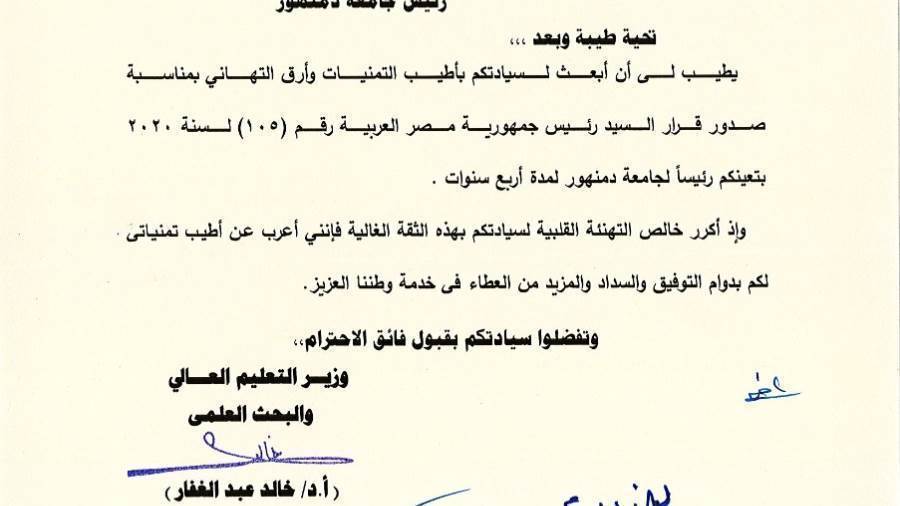 تلقى الدكتور عبيد صالح رئيس جامعة دمنهور خطاب تهنئة من الدكتور خالد عبد الغفار وزير التعليم العالي والبحث العلمي، بمناسبة تجديد الثقة من القيادة السياسية الحكيمة فخامة الرئيس عبد الفتاح السيسي رئيس الجمهورية، وصدور القرار الجمهوري رقم(١٠٥) لسنة ٢٠٢٠، بتعيينه رئيسا لجامعة دمنهور لمدة أربع سنوات، مقدما لسيادته خالص الأمنيات بدوام التوفيق والسداد والمزيد من العطاء فى خدمة وطننا العزيز.