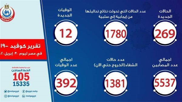 وذكر أن إجمالي العدد الذي تم تسجيله في مصر بفيروس كورونا المستجد حتى اليوم الخميس، هو 5537 حالة من ضمنهم 1381 حالة تم شفاؤها وخرجت من مستشفيات العزل والحجر الصحي، و392 حالة وفاة.