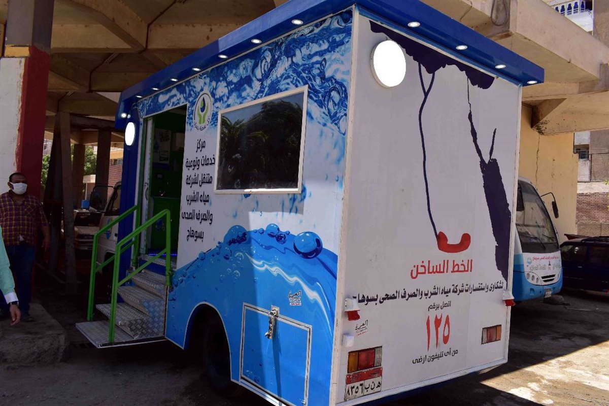 صرح اللواء مهندس محمد بدرى محمد، رئيس مجلس إلإدارة، والعضو المنتدب لشركة مياه الشرب والصرف الصحي بسوهاج، بأن الشركة قامت بتوفير سيارة متنقلة كمركز خدمة عملاء، ولتنفيذ حملات التوعية المائية التي تطلقها الشركة لحث المواطنين على ترشيد استهلاك المياه.