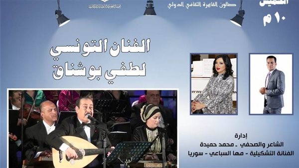 بالتعاون مع الهيئة المصرية العامة للكتاب، برئاسة دكتور هيثم علي الحاج، وضمن الأنشطة التي تقدمها الهيئة، عبر الصفحة الرسمية لمعرض القاهرة الدولي للكتاب، ينظم صالون القاهرة الثقافي الدولي، في العاشرة مساء الخميس 14 رمضان، سهرة موسيقية خاصة للفنان التونسي لطفي بوشناق من خلال البث المباشر عبر صفحتي الصالون.
