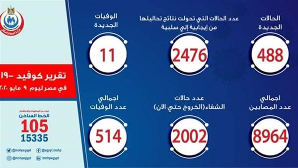وذكر أن إجمالي العدد الذي تم تسجيله في مصر بفيروس كورونا المستجد حتى اليوم، السبت، هو 8964 حالة من ضمنهم 2002 حالة تم شفاؤها وخرجت من مستشفيات العزل والحجر الصحي، و 514 حالة وفاة.
