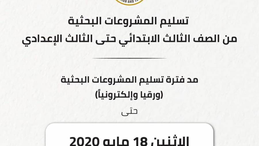 وقالت الوزارة: "حرصًا على سلامة وصحة أبنائنا الطلاب، تم مد فترة تسليم المشروعات البحثية لسنوات النقل من الصف الثالث الابتدائي حتى الثالث الاعدادي، حتى يوم الاثنين الموافق 18 مايو 2020، وذلك للطلاب الذين لم يتمكنوا من تسليم المشروعات إلكترونيًا أو ورقيًا.