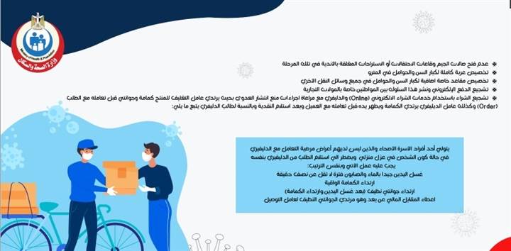 11- تشجيع الشراء باستخدام خدمات الشراء الإلكتروني (online) والدليفري، مع مراعاة إجراءات منع انتشار العدوى، بحيث يرتدي عامل التغليف للمنتج كمامة وجوانتي قبل تعامله مع الطلب (order)، وكذلك عامل الدليفري يرتدي الكمامة ويطهر يده قبل تعامله مع العميل وبعد استلام النقدية، وبالنسبة لطالب الدليفري يتبع ما يلي: يتولى أحد أفراد الأسرة الأصحاء والذين ليس لديهم أعراض مرضية التعامل مع الدليفري، وفي حالة كون الشخص في عزل منزلي ويضطر إلى استلام الطلب من الدليفري بنفسه، يجب عليه عمل الآتي بالترتيب (غسل اليدين جيدا بالماء والصابون فترة لا تقل عن نصف دقيقة- ارتداء الكمامة الواقية- ارتداء جوانتي نظيف (بعد غسل اليدين وارتداء الكمامة)- إعطاء المقابل المالي عن بعد وهو مرتدي الجوانتي النظيف لعامل التوصيل).