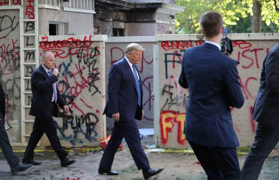 ترامب فى محاولة للاستعراض أمام وسائل الإعلام العالمية عبر سياج حديقة البيت الأبيض إلى الشوارع المحيطة بالبيت الأبيض حتى وصل الى الكنيسة سان جورج المجاورة للبيت الأبيض الموجودة بشارع مجاور والتي حرق المتظاهرين اثناء محاولة اقتحام البيت الأبيض جزء منها حيث قال انها من احب الأماكن الى قلبى فى اشارة إلى انها شهدت تأديته اليمين الدستورية كرئيس للولايات المتحدة. ترامب وقف امام الكنيسة وقفه الواثق من نفسه ليبدو انه الراجل القوى الغير خائف من المتظاهرين بعد ان نقلت اخبار انه اختفى لساعات داخل القبو المحصن اسفل البيت الأبيض ، ترامب حمل نسخه من الدستور الأمريكى ووقف أمام الكنيسة وقال انه سيطبق القانون فى رسالة على مايبدو بانصاره بانه قوى وانه سيواجه الفوضى والتقط الصور التذكارية وهو يمسك بالدستور مع مستشارية الأمنيين . ترامب قال مخاطبا الصحفيين وهو يقف بالشوارع أمام باب الكنيسة أمريكا بلد عظيم وبدل قوى وكبير وستظل قوية وأمنة وسنحافظ عليها ثم عاد ترامب مرة اخرى إلى البيت الابيض وسط حاشيته وحاول استعراض القوة عندما سار وحيدا لعدة امتار بعيد عن حراسه الشخصيين فى ظل وجود شرطة مكافحة للشغب التي اصطفت بالحديقة معلنه فرض حظر التجول بالشوارع المحيطة حيث تم فرض حظر التجول من الساعة السابعة مساءاً .