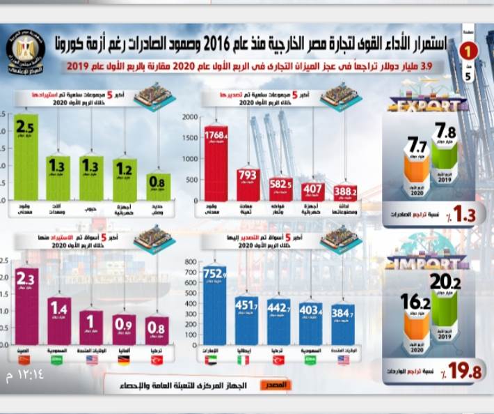 وجاء في الإنفوجراف، تراجع عجز الميزان التجاري بمقدار 3.9 مليار دولار في الربع الأول من عام 2020، مقارنة بالربع الأول من عام 2019، وكذلك تراجع الصادرات بنسبة 1.3%، لتصل إلى 7.7 مليار دولار خلال الربع الأول من عام 2020، مقارنة بـ 7.8 مليار دولار خلال الربع ذاته من عام 2019، فضلاً عن تراجع الواردات بنسبة 19.8%، لتصل إلى 16.2 مليار دولار خلال الربع الأول من عام 2020، مقارنة بـ 20.2 مليار دولار خلال نفس الربع من عام 2019.