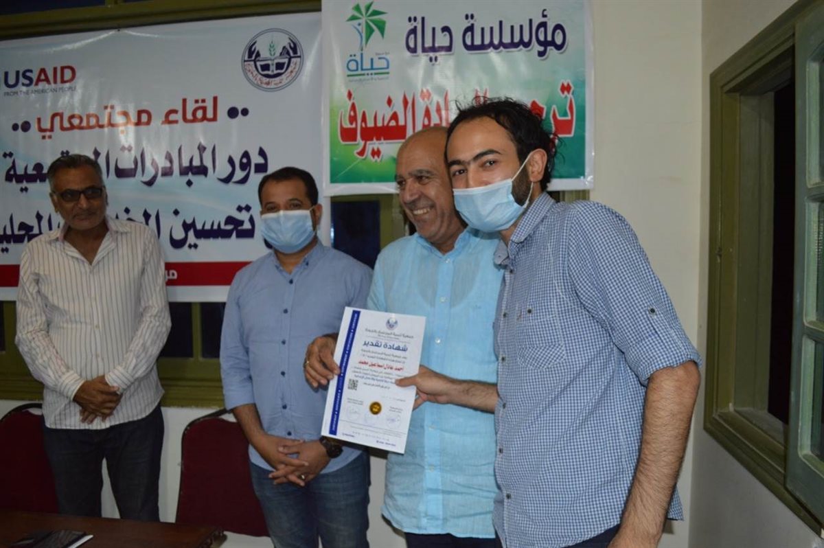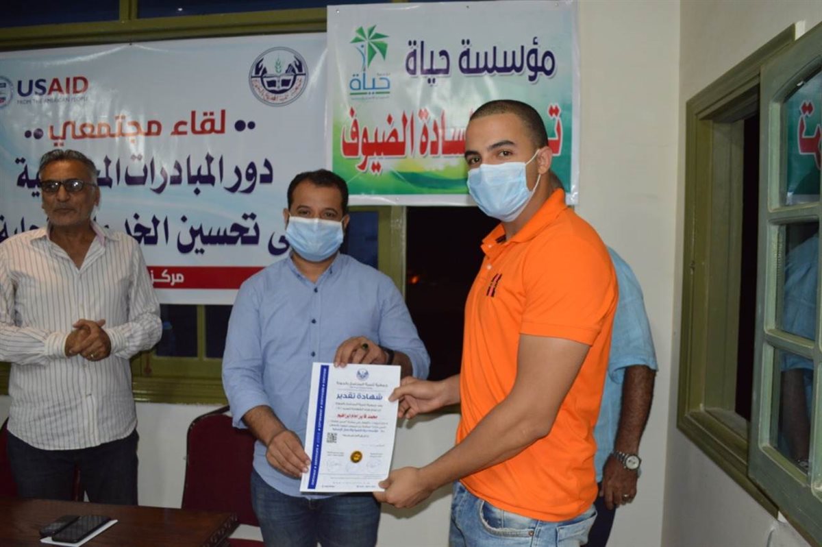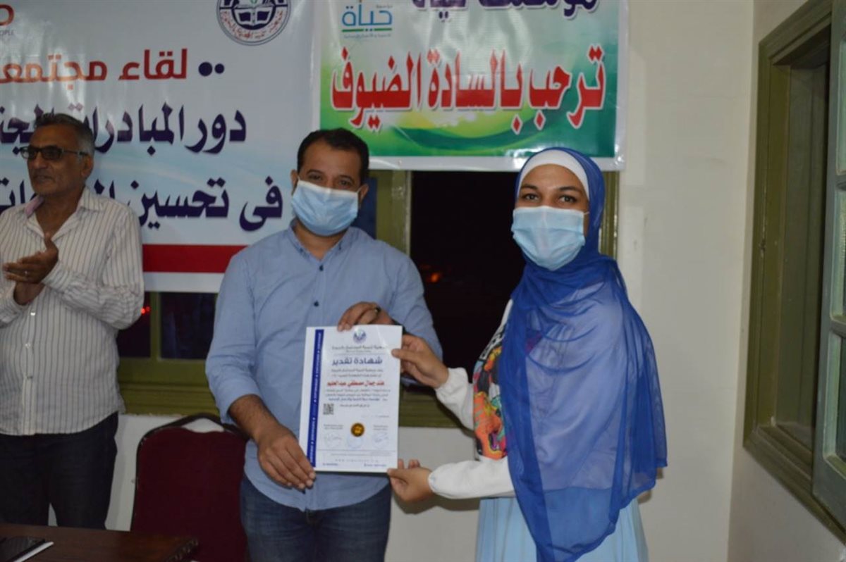 كرمت جمعية تنمية المجتمع بالجورة فى شمال سيناء ( اليوم ) فريق تنفيذ مبادرة : " احمى نفسك .. احمى بلدك " تقديرا لهم على دورهم المتميز فى تنفيذ فعاليات المبادرة التي تم إطلاقها ( بتعاون مشترك بين مؤسسة حياة للتنمية والأعمال الانسانية بسيناء وجمعية تنمية المجتمع بالجورة ) مع بداية ظهور جائحة كورونا ، وتضمنت توزيع أدوات تعقيم ومواد تطهير على الأسر فى مختلف أحياء مدينة العريش ، وتوفير مساعدات طبية للأطقم الصحية العاملة فى قسم العزل بمستشفيات المحافظة فى مدن : العريش وبئر العبد والشيخ زويد .