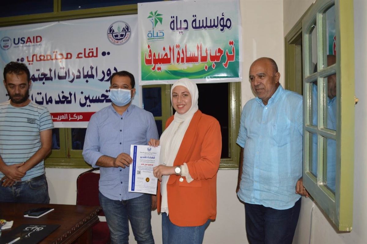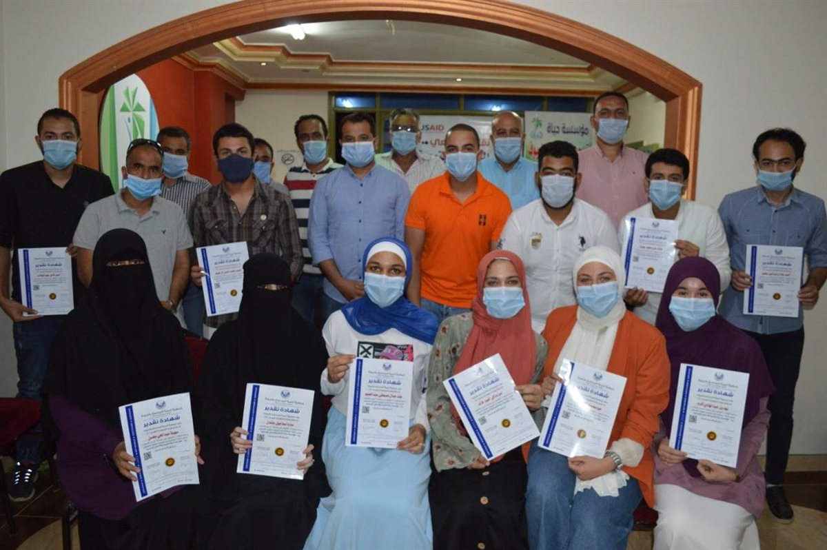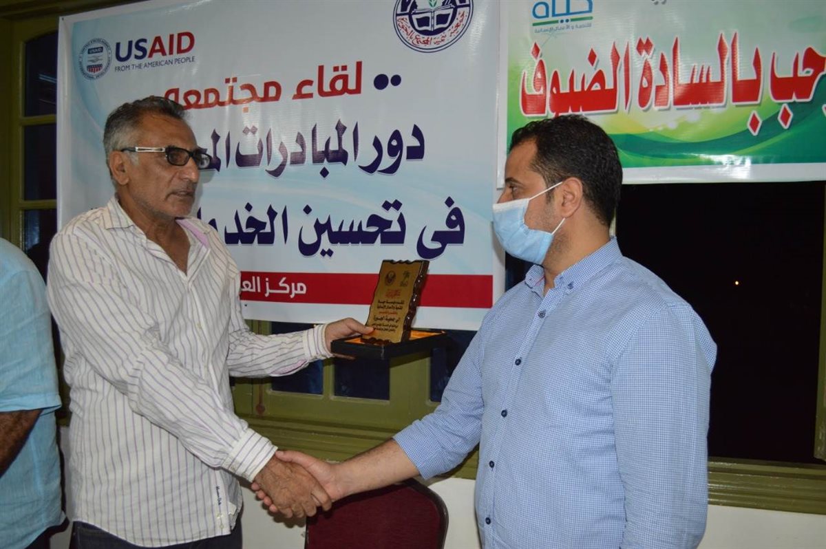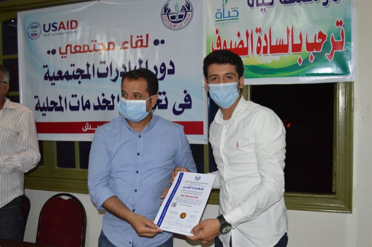 كرمت جمعية تنمية المجتمع بالجورة فى شمال سيناء ( اليوم ) فريق تنفيذ مبادرة : " احمى نفسك .. احمى بلدك " تقديرا لهم على دورهم المتميز فى تنفيذ فعاليات المبادرة التي تم إطلاقها ( بتعاون مشترك بين مؤسسة حياة للتنمية والأعمال الانسانية بسيناء وجمعية تنمية المجتمع بالجورة ) مع بداية ظهور جائحة كورونا ، وتضمنت توزيع أدوات تعقيم ومواد تطهير على الأسر فى مختلف أحياء مدينة العريش ، وتوفير مساعدات طبية للأطقم الصحية العاملة فى قسم العزل بمستشفيات المحافظة فى مدن : العريش وبئر العبد والشيخ زويد .