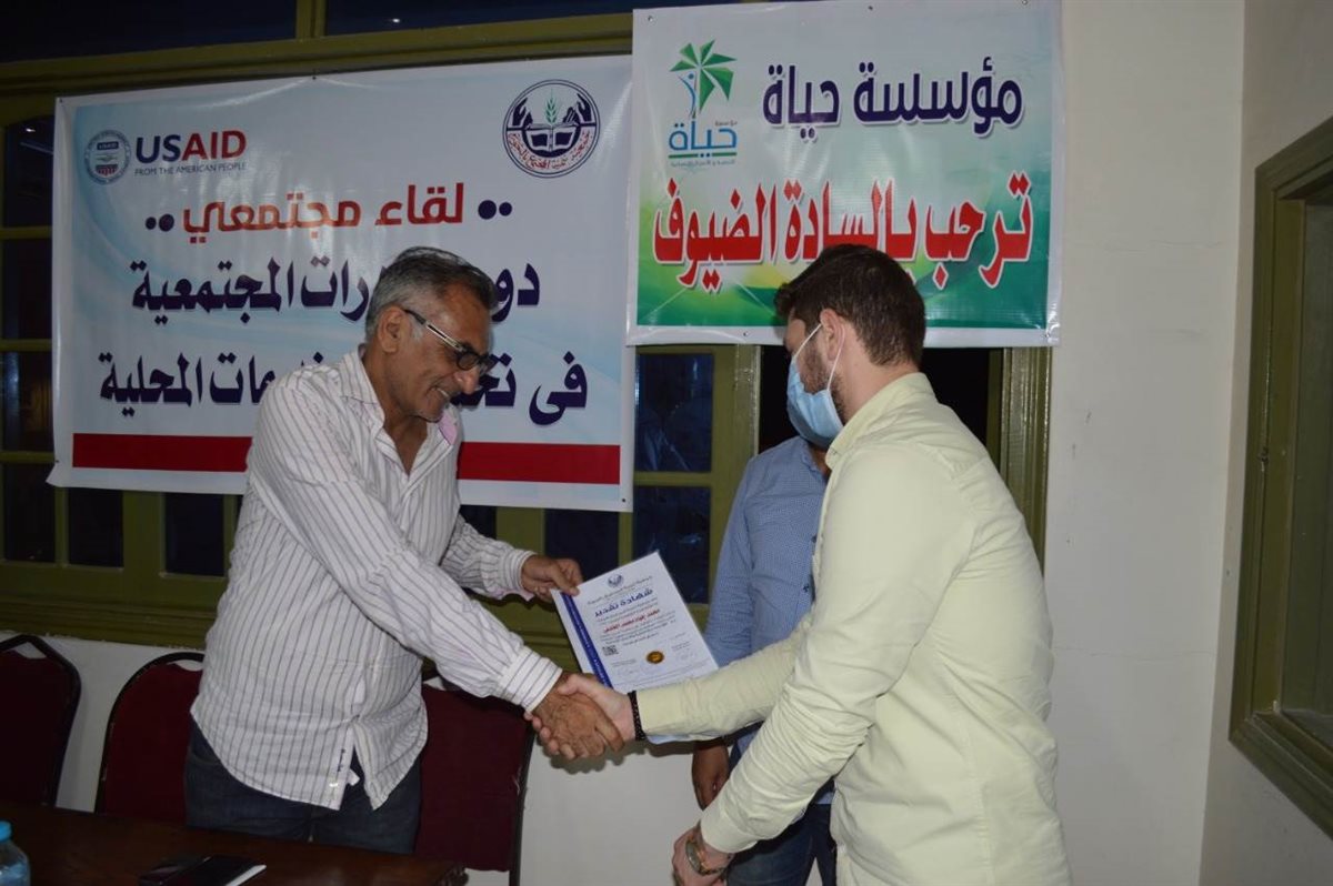 كما قام عادل رستم نائب رئيس مجلس أمناء مؤسسة حياة للتنمية والأعمال الانسانية .. يرافقه اسلام عروج الأمين العام للمؤسسة ومحمد عابد أمين الصندوق بالمؤسسة .. بتسليم وثيقة شكر وتقدير الى ممثلى جمعية تنمية المجتمع بالجورة على التعاون المثمر بين الجانبين ، والذي عكس توحد جهود مؤسسات المجتمع المدنى لخدمة المجتمع وتضامنها مع جهود الدولة فى مواجهة جائحة كورونا .. معربين عن أملهم فى استمرار التعاون مستقبلا فى مبادرات ومشروعات جديدة مع جمعية تنمية المجتمع بالجورة باعتبارها نموذج مشرف لمنظمات المجتمع المدنى واحدى أهم الجمعيات الأهلية الرائدة التي كسبت الثقة فى شمال سيناء وعموم محافظات مصر حتى أصبحت احدى أهم مؤسسات ومنظمات المجتمع الفاعلة فى خدمة المجتمع .