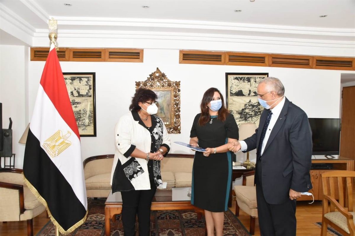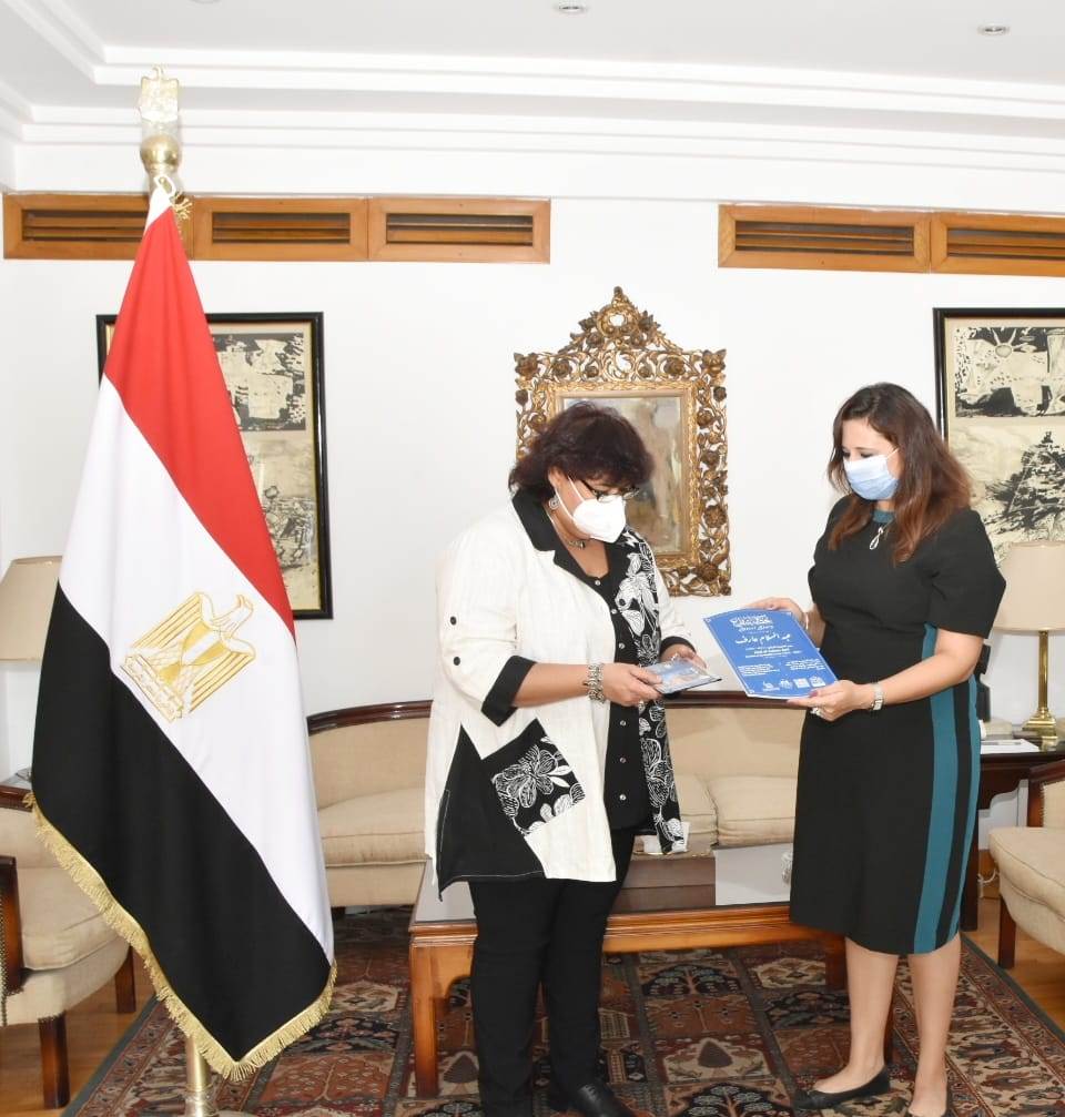 وخلال اللقاء رحبت الدكتورة إيناس عبد الدايم بحفيدة الرئيس الراحل مؤكدة ان مصر تفتح ذراعيها دائما لأشقائها العرب.