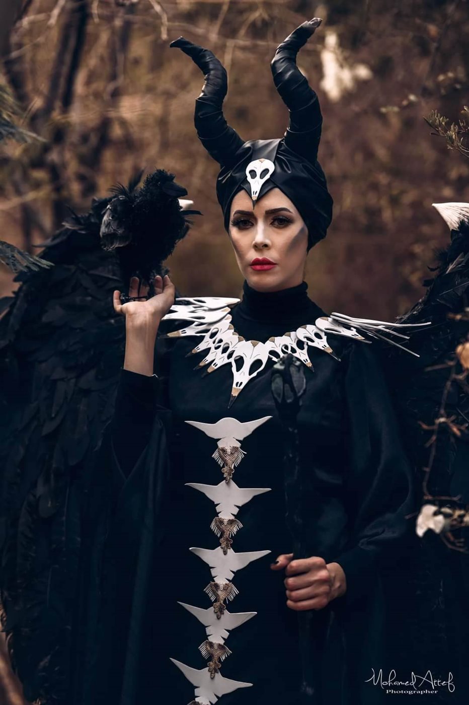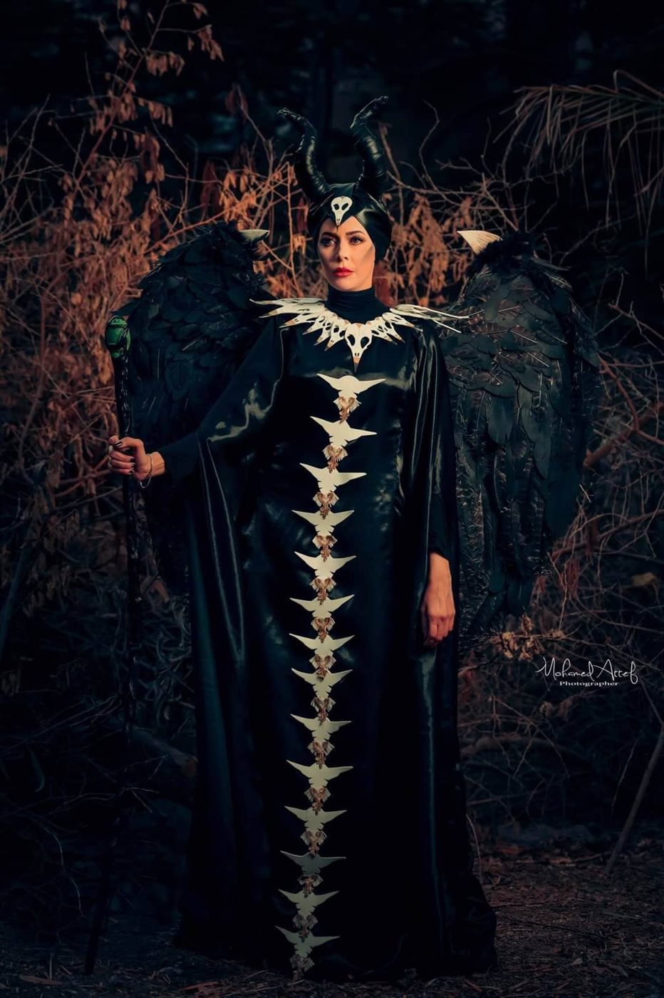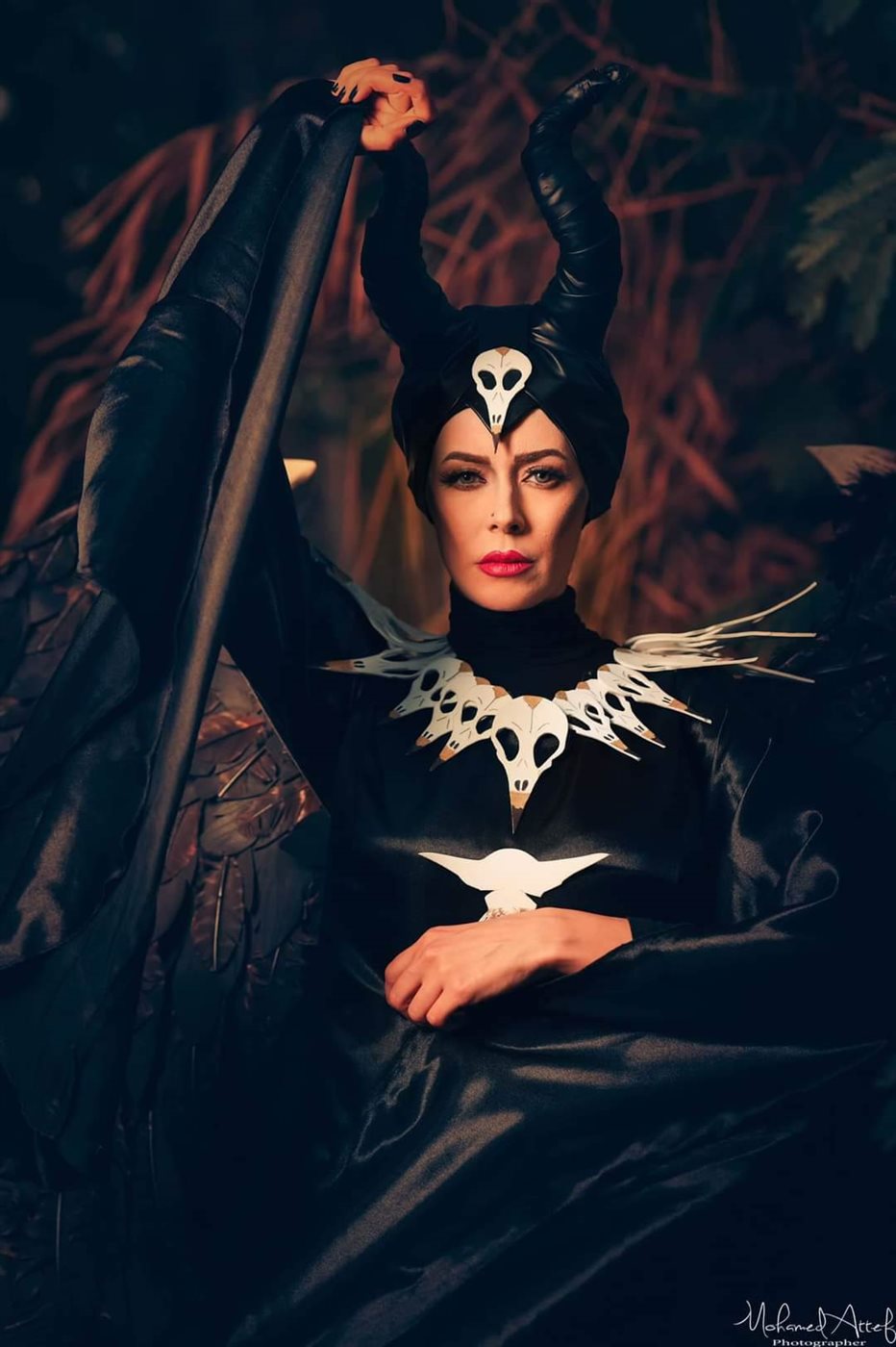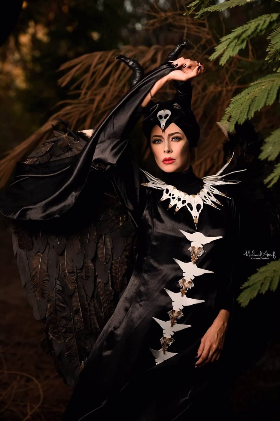ولإكمال الإطلالة أضافت مني الجمل بأناملها مكياج حاد وجرئ يتشابه مع أنجلينا جولي في شخصية Maleficent، وجسدت الشخصية باحترافية الموديل ياسمين محسن.