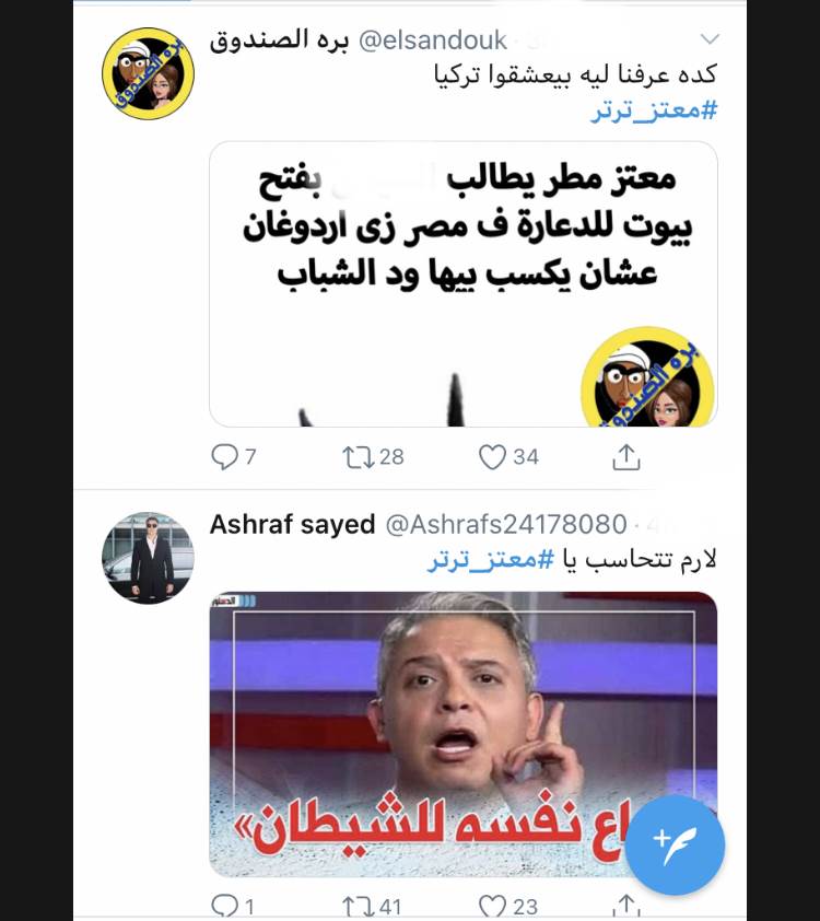 وقام رواد موقع التواصل بنشر هشتاج #معتز _ترتر مصحوب بصورة له و تسريباته وتصريحاته المدافعة عن الاغا التركي رجب أردوغان الذي ارتمي الموالين لجماعة الاخوان الارهابية في أحضانه كما يتنفذ تعليمات أسياده أرباب السبوبة "تميم" أمير تنظيم الحمدين .