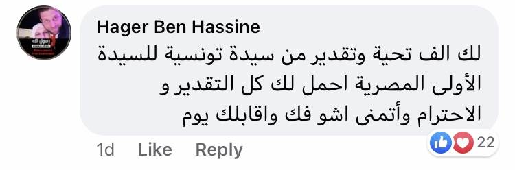 وعلقت سيدة تونسية على صفحة السيدة انتصار الرسمية قائلة: "لك ألف تحية وتقدير من سيدة تونسية للسيدة الأولى المصرية أحمل لك كل التقدير و الاحترام وأتمنى أشوفك وأقابلك يوم".