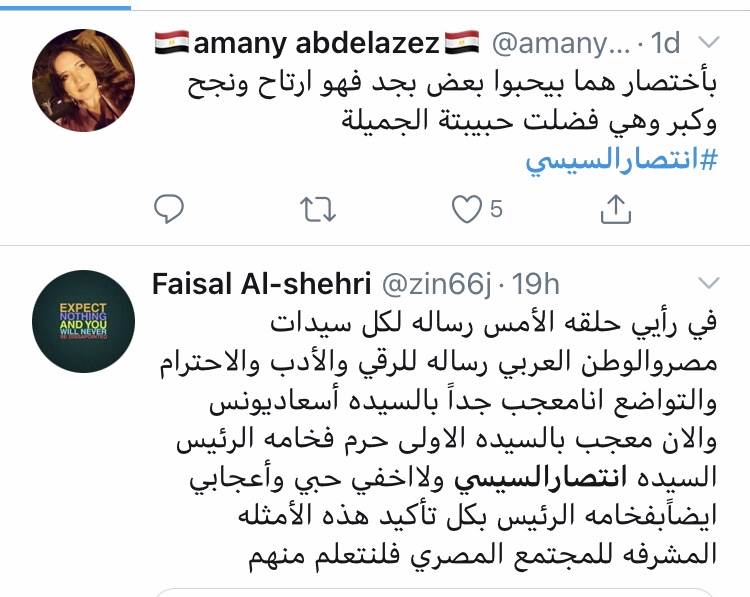 ومن بين التعليقات: "في رأيي حلقة الأمس رسالة لكل سيدات مصر والوطن العربي رسالة للرقي والأدب والاحترام والتواضع أنا معجب جداً بالسيدة اسعاد يونس ، ومعجب بالسيدة الأولى حرم فخامة الرئيس السيدة انتصارالسيسي ولا أخفي حبي وإعجابي أيضاً بفخامة الرئيس.. بكل تأكيد هذه الأمثلة المشرفة للمجتمع المصري فلنتعلم منهم".