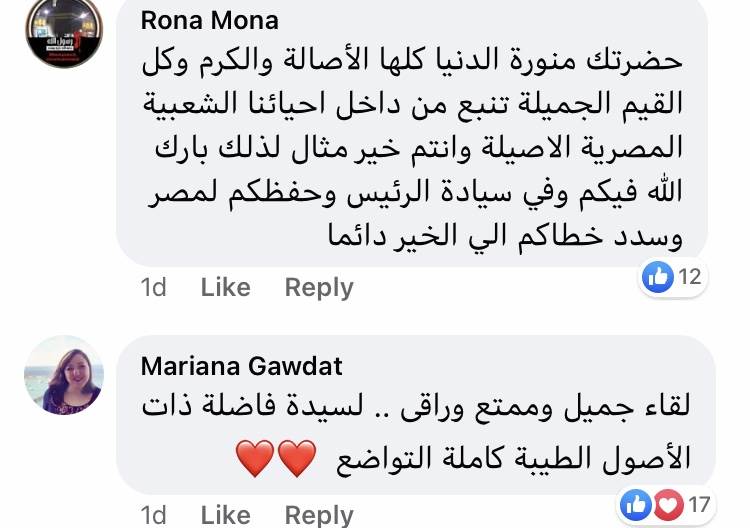 "حضرتك منورة الدنيا كلها الأصالة والكرم وكل القيم الجميلة تنبع من داخل أحيائنا الشعبية المصرية الاصيلة وأنتم خير مثال لذلك بارك الله فيكم وفي سيادة الرئيس وحفظكم لمصر وسدد خطاكم الي الخير دائما".