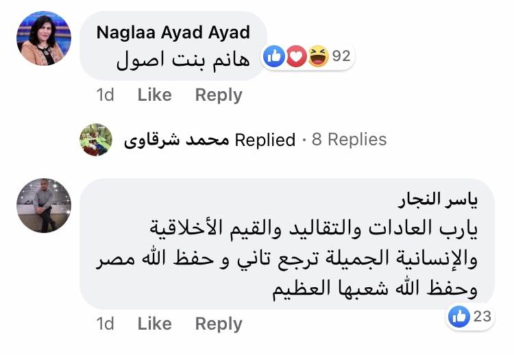 ومن بين التعليقات: "يا رب العادات والتقاليد والقيم الأخلاقية والإنسانية الجميلة ترجع تاني وحفظ الله مصر وحفظ الله شعبها العظيم".