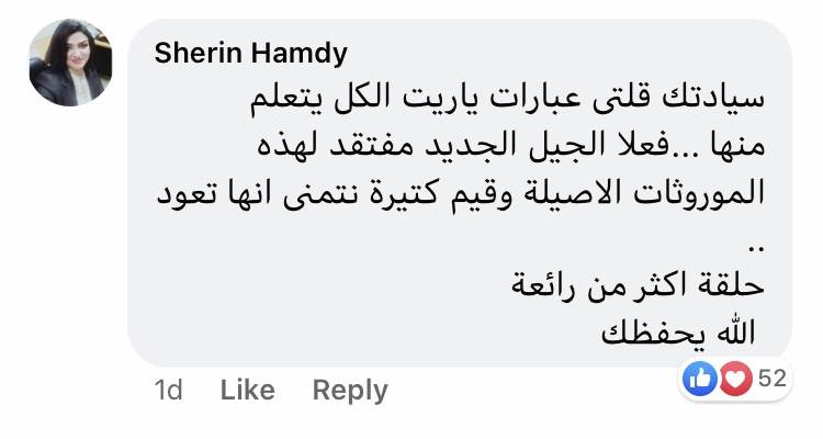 "سيادتك قلتي عبارات ياريت الكل يتعلم منها... فعلا الجيل الجديد مفتقد لهذه الموروثات الأصيلة وقيم كتيرة نتمنى أنها تعود حلقة أكثر من رائعة.. الله يحفظك".