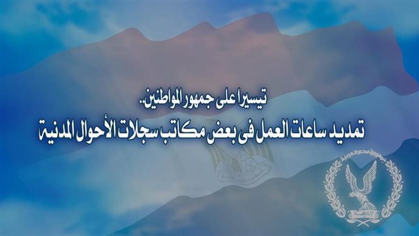 قررت وزارة الداخلية بقيادة اللواء محمود توفيق وزير الداخلية، تمديد ساعات العمل فى بعض مكاتب سجلات الأحوال المدنية، وذلك تيسيراً على جمهور المواطنين.
