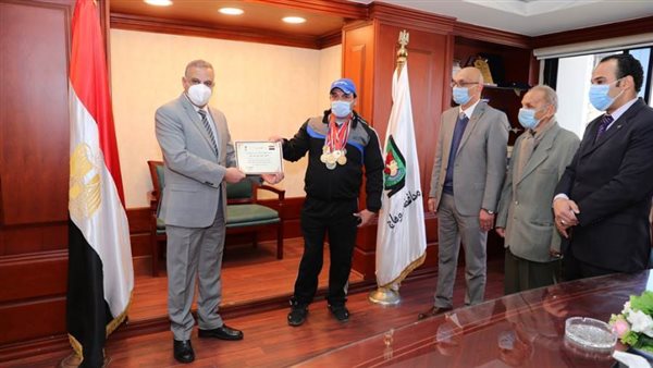 كرم اللواء طارق الفقي محافظ سوهاج، اليوم، 16 من لاعبي نادي الإيمان لذوى الهمم والجهاز الفني الفائزين بالمراكز الأولى في بطولة الجمهورية لألعاب القوى للإعاقات الذهنية، والإعاقات الحركية عمومي، تقديراً لجهودهم ومساهمتهم في رفع اسم " سوهاج " عالياً بين المحافظات المتنافسة بالبطولة.