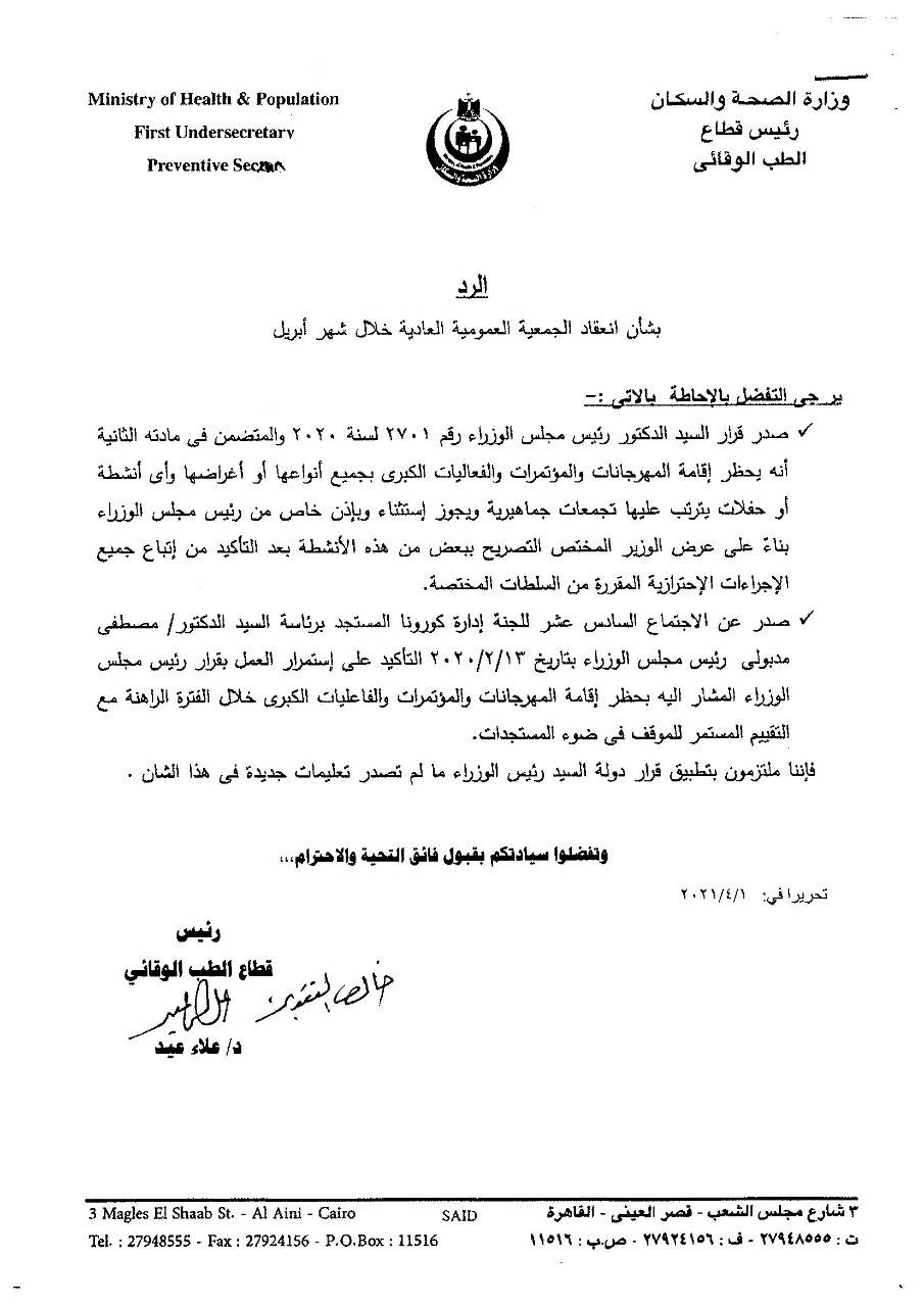 وأكدت وزارة الصحة فى خطابها، أن كافة مؤسسات الدولة مازالت ملتزمة بقرار رئيس مجلس الوزراء رقم 2701 لسنة 2020، والذي تضمن حظر إقامة المهرجانات والمؤتمرات والفعاليات الكبرى بجميع أنواعها أو أغراضها، وأى أنشطة أو حفلات يترتب عليها تجمعات جماهيرية، وكذلك القرار الصادر بتاريخ 13 فبراير 2020، والذي أكد استمرار العمل بقرار رئيس مجلس الوزراء بحظر إقامة الفعاليات الكبرى والمؤتمرات، خلال الفترة الراهنة.