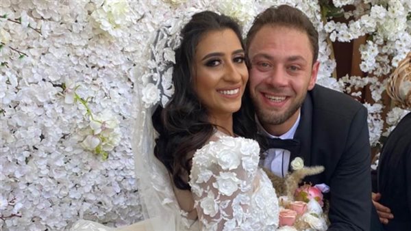 وأطلت العروس بفستان زفاف أبيض منفوش مع طرحة طويلة، أما محمد علي رزق فظهر ببذلة سوداء رسمية وبابيون.