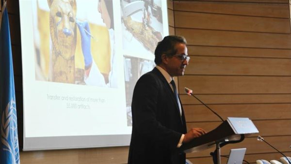 ثم قام الوزير بإطلاع الحاضرين على آخر أهم الاكتشافات الأثرية ومستجدات الأعمال الخاصة بالمواقع الأثرية المصرية، والبعثات الأثرية المصرية والأجنبية، وقصص النجاح حول إعادة القطع الأثرية المصرية التي تم سرقتها وتهريبها للخارج. كما سلط الوزير الضوء على أحدث افتتاحات المتاحف الجديدة ومشروعات الترميم، ومساعي وزارة السياحة والآثار في تحسين خدمات الزائرين بالمواقع الأثرية والمتاحف واتاحتها لذوي الهمم ومنها تطوير منطقة أهرامات الجيزة وقلعة صلاح الدين الايوبي وغيرها وذلك لتحسين تجربة زائريها بالاضافة إلى ما تقوم به الوزارة من جهد لرفع الوعي الأثري لدي المواطنين المصريين وخاصة الأطفال، والمساهمة في رفاهية المجتمعات المحلية من خلال تعزيز الحرف اليدوية المحلية، فضلا عن المشروعات القائمة بالمواقع المصرية ومنها مشروع تخفيض منسوب المياه الجوفية بموقع أبو مينا احد مواقع التراث العالمي وكوم الشقافة بالإسكندرية وكوم امبو بأسوان و الأوزيريون بسوهاج وكذلك ماتم افتتاحه من مشروعات تطوير لبعض المناطق الواقعة على مسار رحلة العائلة المقدسة في مصر.