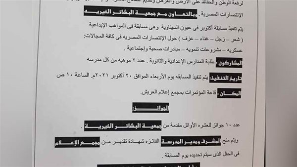 بمناسبة الذكرى 48 لانتصارات السادس من أكتوبر 1973.. تنظم ادارة اعلام سيناء مسابقة ثقافية متنوعة فى المواهب الابداعية لطلاب المدارس باسم: "أكتوبر فى عيون السيناوية"، وذلك يوم الأربعاء القادم الموافق 20 من أكتوبر الجاري.